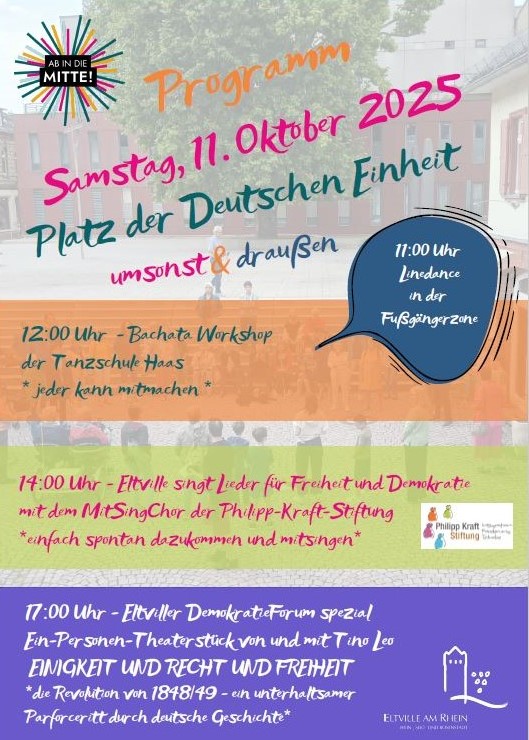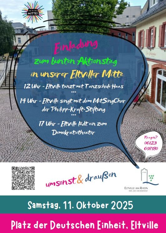 Am 11. Oktober 2025 wird es in Eltville einen besonderen und vielseitigen Samstag in der Eltviller Innenstadt geben, denn die Stadtverwaltung ruft gemeinsam mit ihren Partnern Tanzschule Haas und Phillipp-Kraft-Stiftung zum Tanzen und Singen in der städtischen Mitte auf und lädt die Bevölkerung zu einem Open-Air-Demokratietheater auf dem Platz der Deutschen Einheit ein.